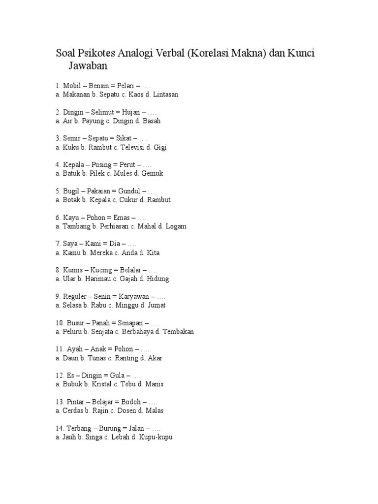 Contoh soal psikotes kemampuan verbal ini meliputi sinonim (persamaan kata), antonim (lawan kata), analogi dan korelasi makna. Contoh soal tes akademik polri 2018 dan kunci jawaban doc psikotes calon . Contoh soal psikotes dan jawabannya said. Download soal psikotes polri dan jawabannya doc. Intelligence quotient adalah istilah umum yang digunakan untuk .